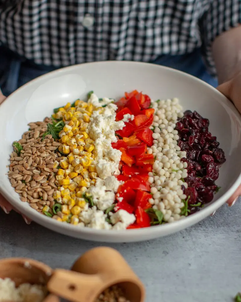 organic arugula, pearl couscous, all-natural feta, red peppers, organic dried sweet corn, dried cranberries, toasted sunflower seeds & all-natural pesto vinaigrette served with artisan bread