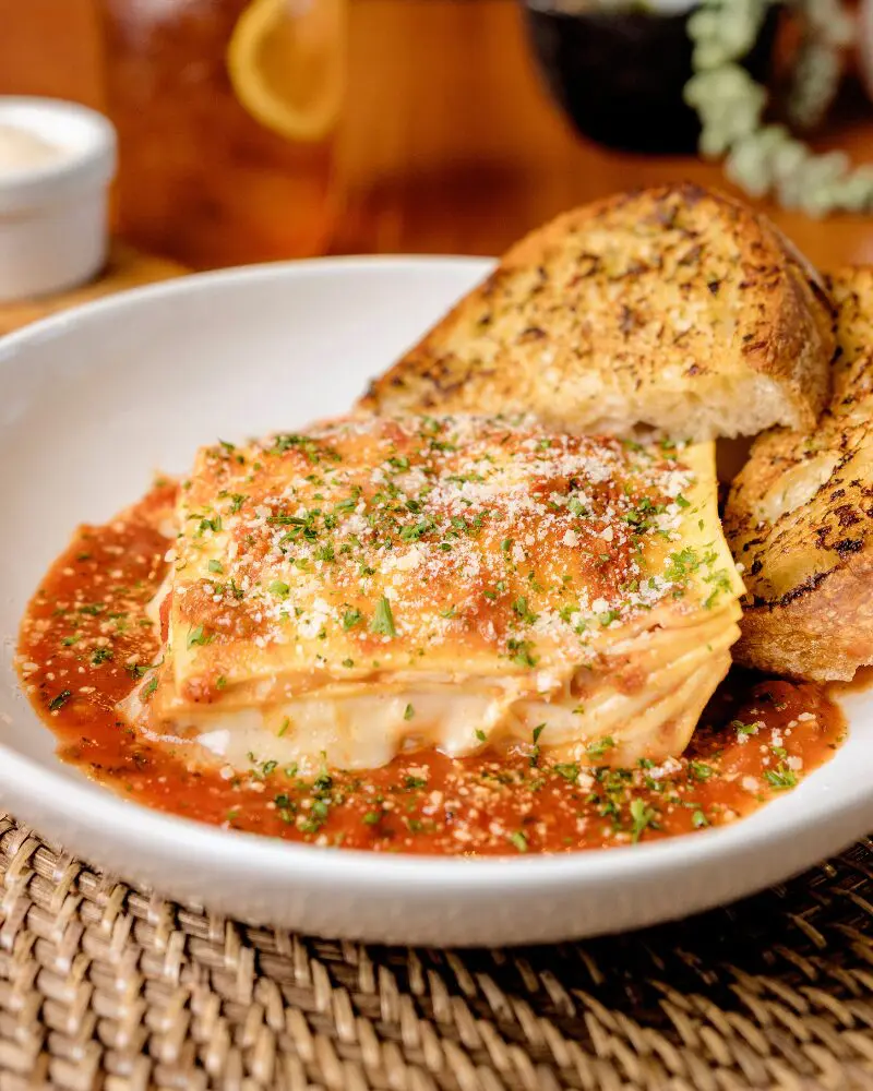 fresh pasta layered with a beef & pork ragu, mozzarella, ricotta & marinara topped with parmesan & parsley & served with garlic bread