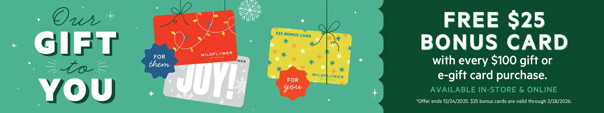 Get a $25 bonus card on us when you purchase $100 in gift or e-gift cards now through Wednesday, 12/24! Bonus cards are valid through 2/28/26.